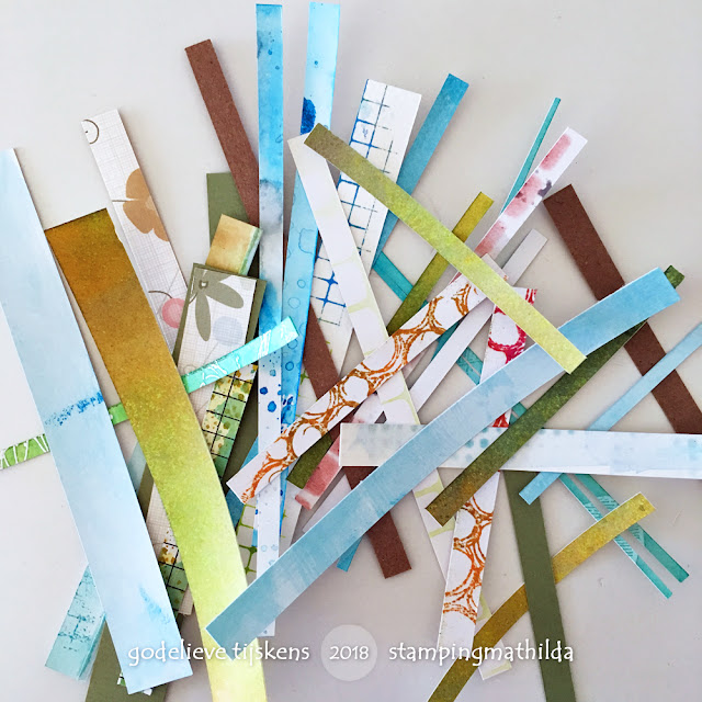 Zoals gewoonlijk op zondag, maakte ik weer iets met restjes. Vandaag vond ik een omslag met papierstrookjes in mijn stempelhok, die moesten gebruikt worden.