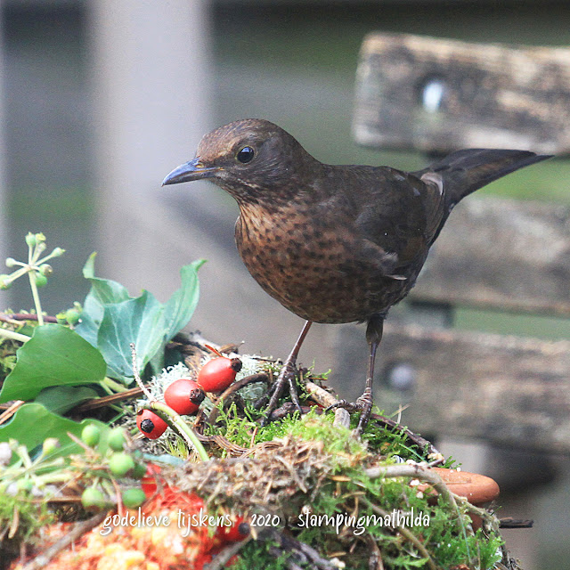 Oh, zo mooi, die merels, prachtige foto's en ook een heel prachtige krans ! Ik heb ook veel extra vogelvoer buiten, en een vogeltaart. Nog een fijne Kerstdag ! Enny