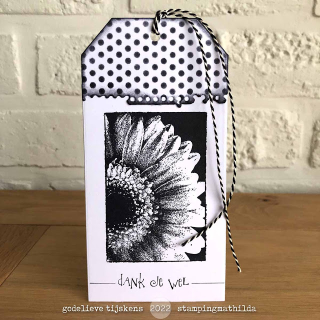 Ook dit jaar ga ik verder met mijn zwart-wit reeks. Vandaag maakte ik dit label. De bloemenstempel vind ik zo mooi. Het label werd uitgesneden met een stans van Elisabeth Craft Designs.
